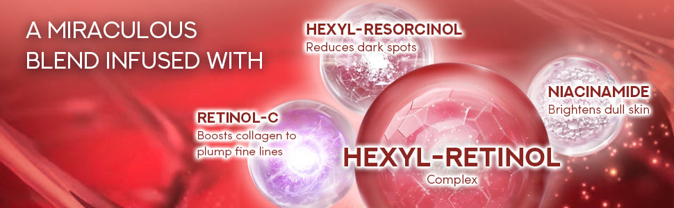 Hexylresorcinol is a brightening powerhouse, reduces dark spots and boost skin’s radiance. While Retinol-C is a gentle form on ‘Retinol’, which plumps fine lines and improves skin elasticity