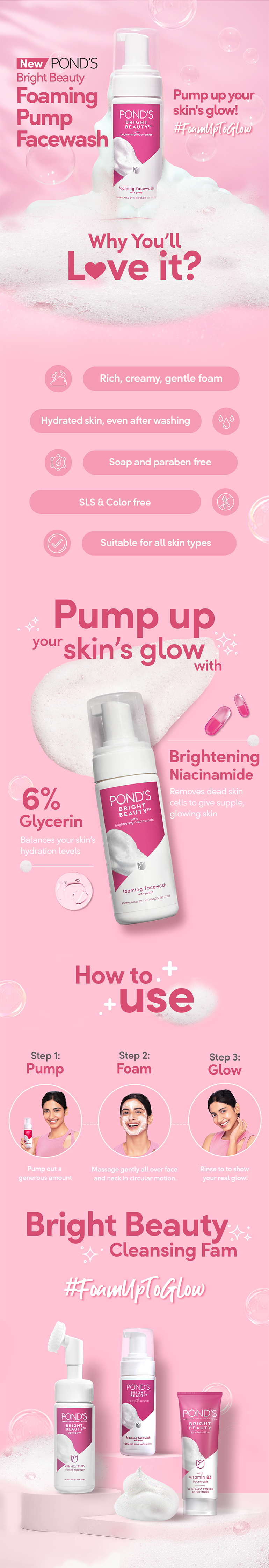 Daily impurities can settle into your pores and make your skin look dull. It's time to pump up your skin's glow with the all-new POND'S Bright Beauty Foaming Pump Facewash. With the goodness of Brightening Niacinamide, this facewash gently yet effectively removes the layer of dead skin cells from your skin and reveals your inner glow! That's not it! It's made up of 6% Glycerin and has a very creamy, rich, foam texture that keeps your skin hydrated and glowing even after washing! It comes with a hassle-free pump which pumps out the luxurious foaming facewash in a super easy manner and then you're all set for your 3 step glow routine! Pump out a small amount onto your palm, massage gently all over your face including the neck region and work your way through a creamy, rich lather, rinse off completely and pat dry. There you have it, just pump, foam and GLOW! Free from silicones, parabens and color, the POND'S Bright Beauty Foaming Pump Facewash is suitable for all skin types & is super gentle on the skin but does not spare the dirt! For glowing, hydrated skin, upgrade to POND'S Bright Beauty Foaming Pump Facewash! Glowing skin, is now a pump away!