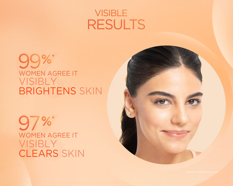 This serum effectively targets blemishes such as, acne marks, dark patches, and spots, leaving your skin visibly brighter and clearer. Its non-sticky, non-irritant, quick-absorbing formula makes it easier to incorporate into your skincare routine. In a consumer study conducted in 2023, majority of women reported visible results after using this serum. 99%* of women agreed it visibly brightens skin, 97%* agreed it visibly clears skin, 99%* agreed it is lightweight and fast-absorbing, and 99%* agreed it’s a non-irritant, 99% women agree it reduces blemishes and makes skin smooth.