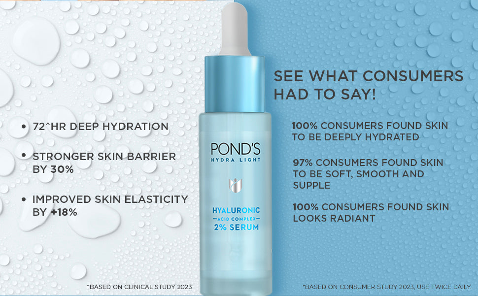 - 1. Intense Hydration: POND'S Hydra Light serum consists of micro hyaluronic acid molecules that help restore moisture in the deepest layer of your skin from the very first application. Achieve the desired fresh skin texture by simply incorporating this hyaluronic acid serum into your daily skincare regime.