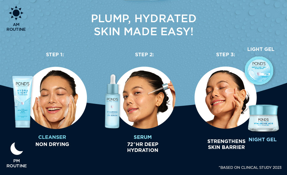Use the entire hydration range for best results. After facewash, use POND'S Hydra Light Hyaluronic Acid Complex 2% Serum and POND'S Super Light Gel for day. And POND'S Hydra Light Hyaluronic Acid Complex 2% Serum and POND'S Hydrating Night gel at night post wash every day.